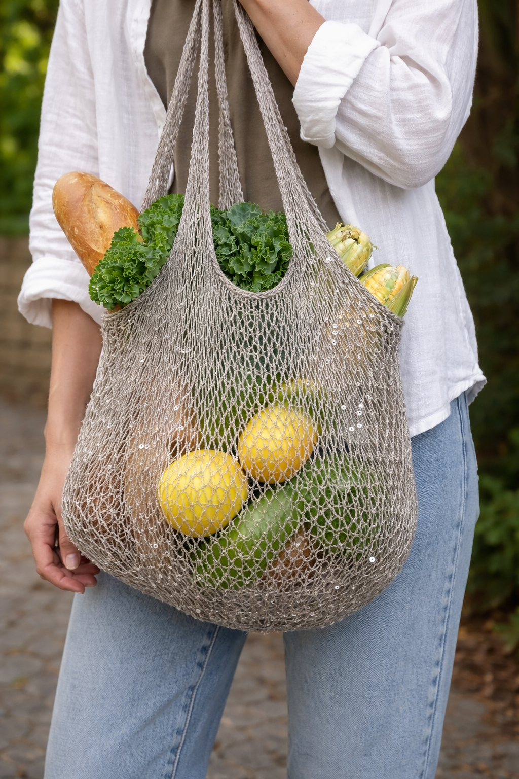 This pattern pairs beautifully with a lightweight cotton yarn. When you add small, irregularly placed sequins into the fabric, the result is a market bag with a subtle, unexpected shimmer. The sequins catch daylight without weighing down the mesh, letting texture and functionality stay front and center. Knitters who enjoy projects that balance utility and visual interest will appreciate how the irregular sparkle brings a fresh twist to a classic carry-all.