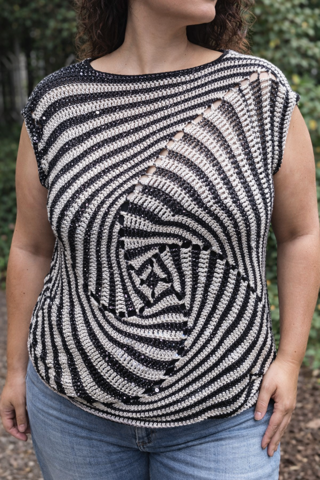 Kaleidoscope Top is a bold and graphic crochet garment that makes texture the main feature. The repeating stitch pattern creates a strong visual rhythm and an airy fabric that works beautifully for warm weather wear. Its shape is modern and versatile, easy to style with both casual and more polished outfits.