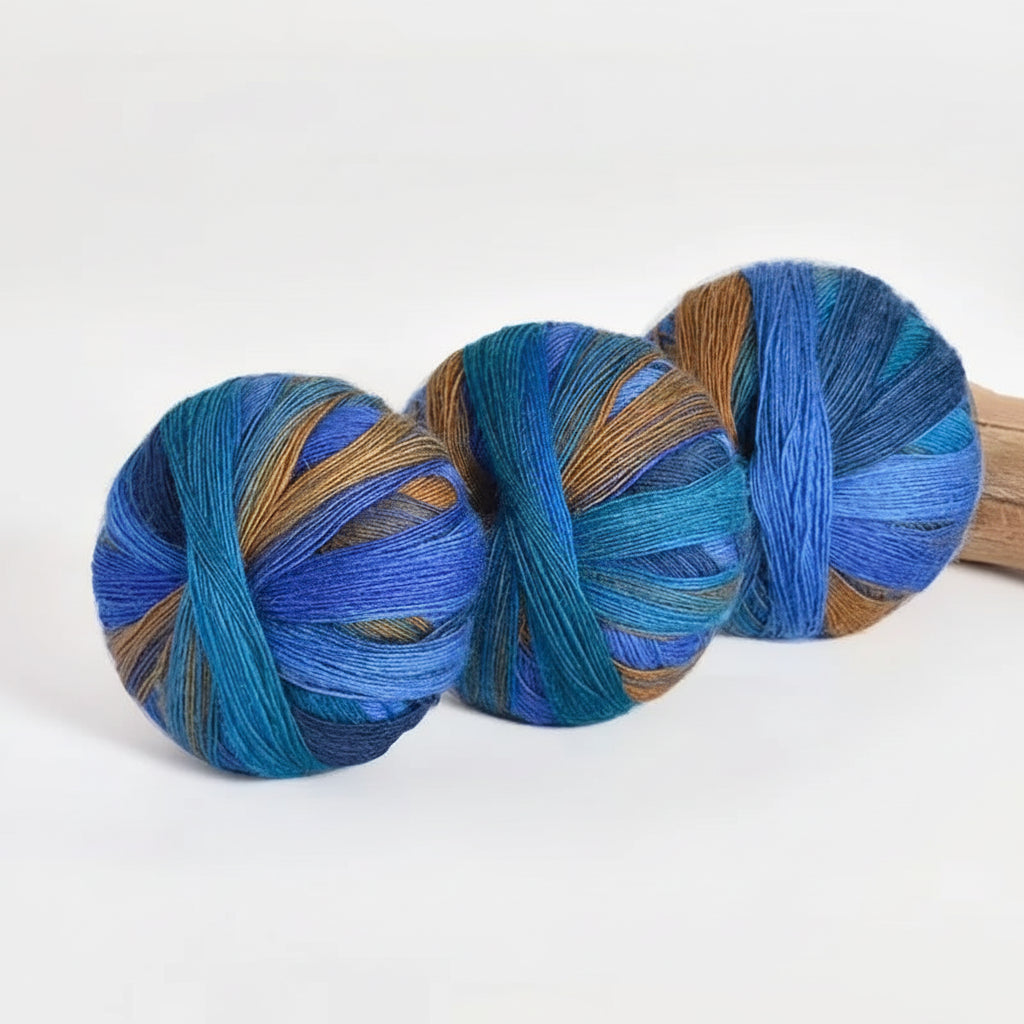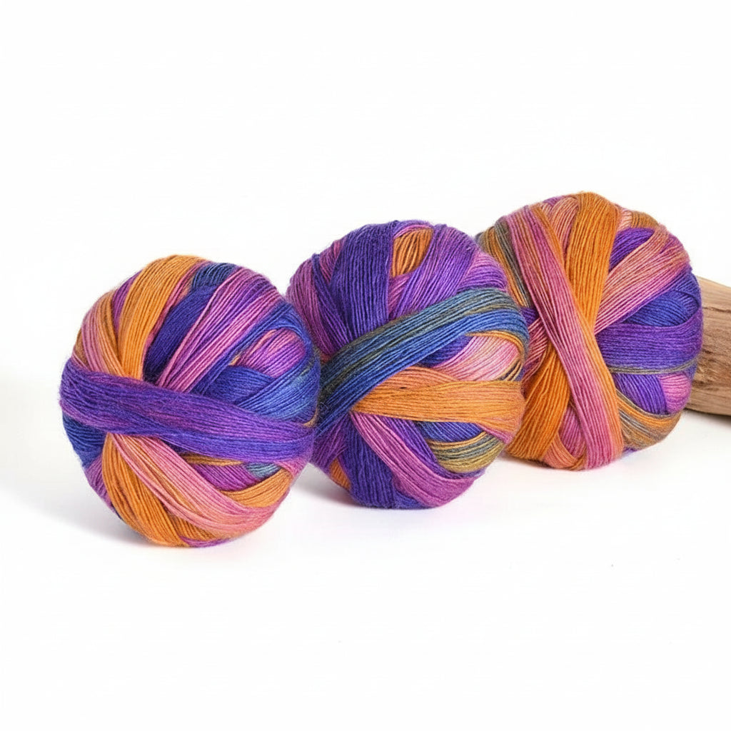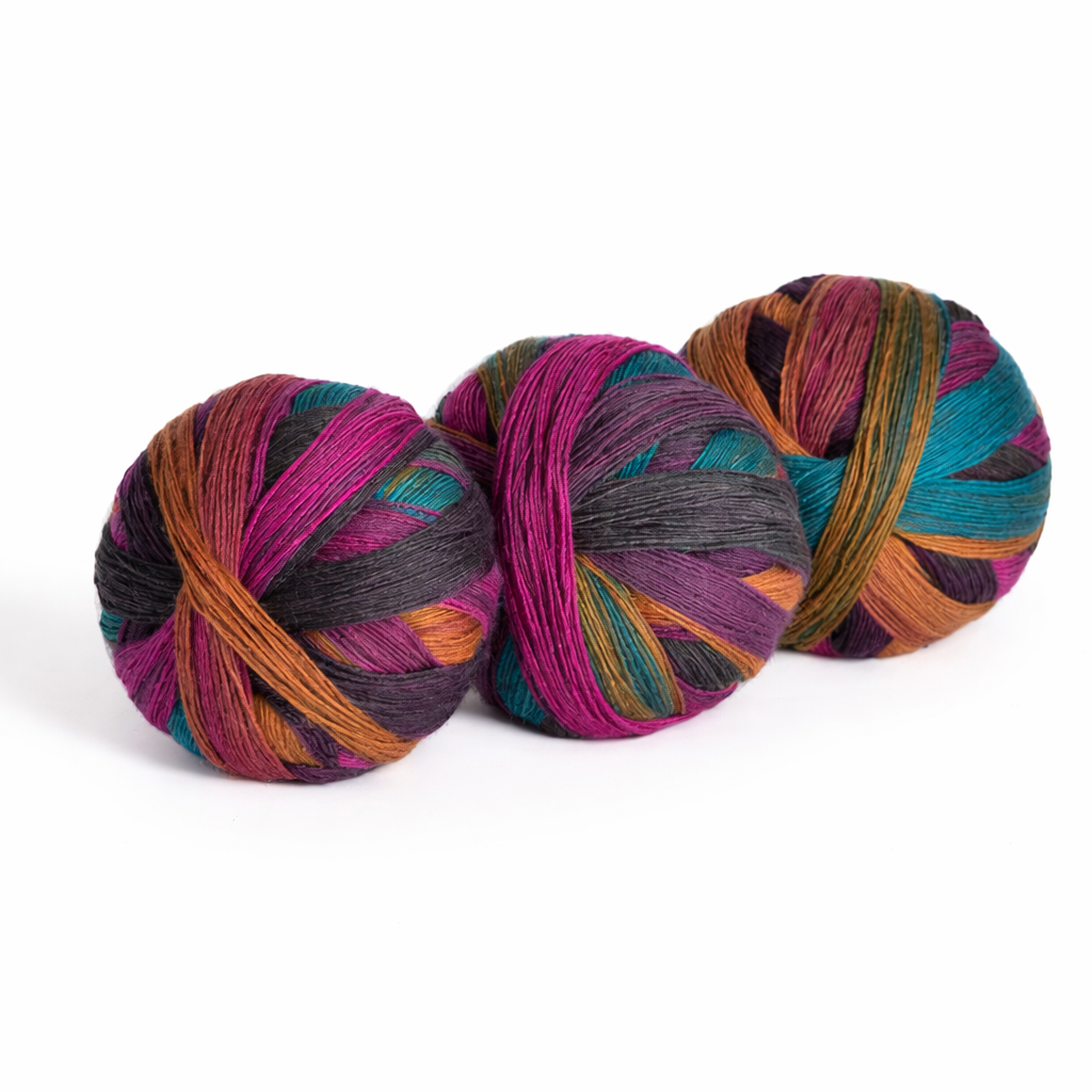 Each skein weighs 100 g and contains approximately 500 meters or 547 yards of yarn. The long gradient colour changes make this yarn especially suitable for shawls, scarves, wraps, garments, and statement accessories where colour flow is part of the design.